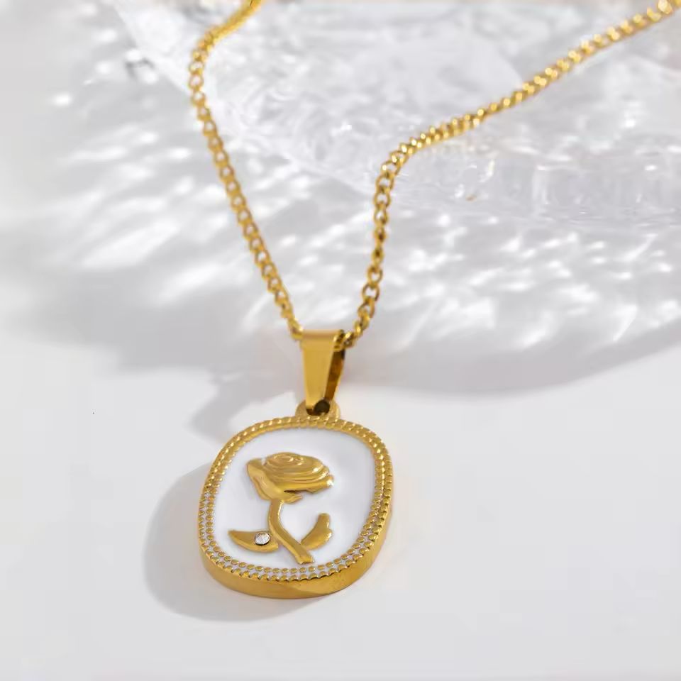 Embrace refined elegance with our Golden Rose Pendant Necklace. This beautifully crafted piece showcases a delicate golden rose, subtly accented with a sparkling stone, adding a touch of brilliance to its timeless design.