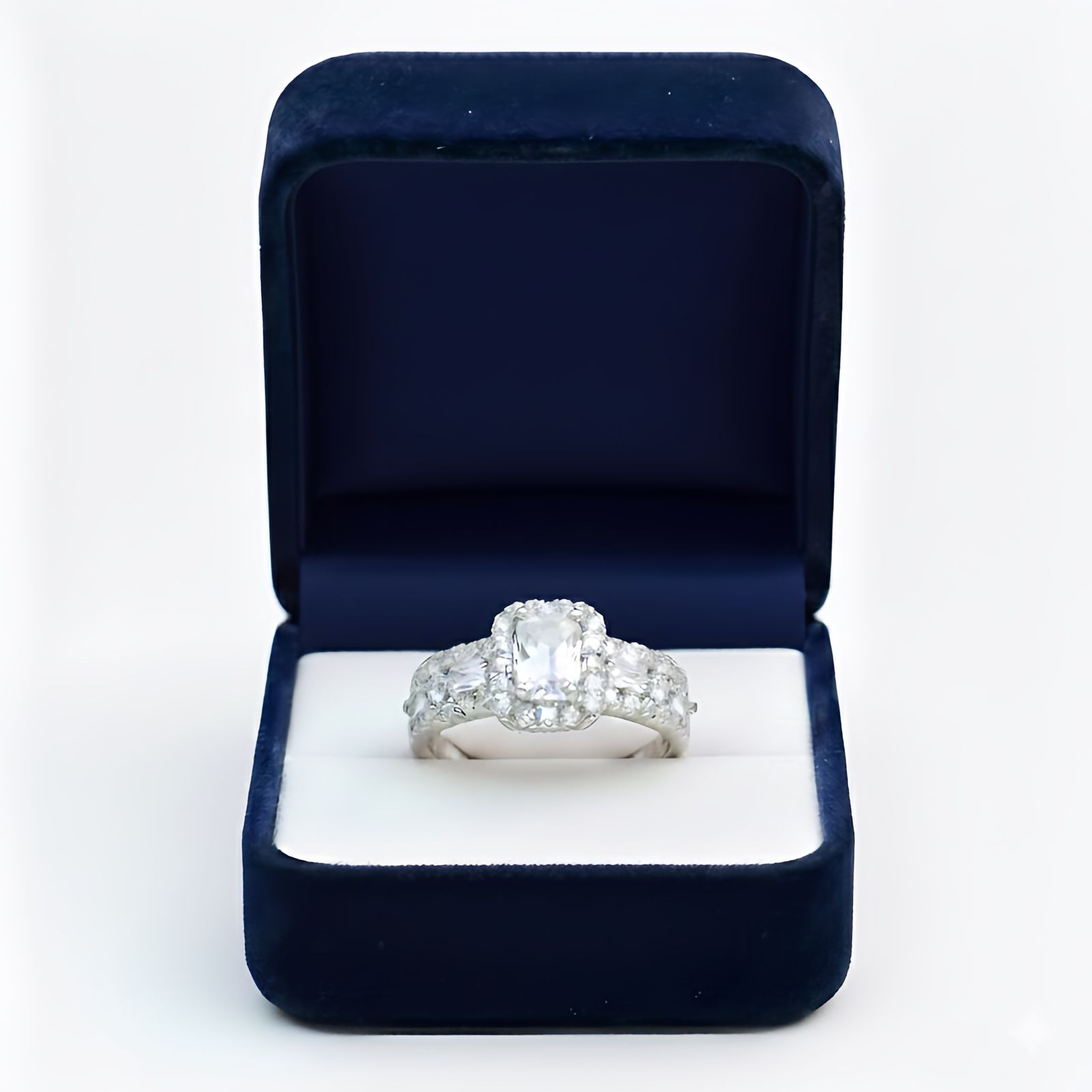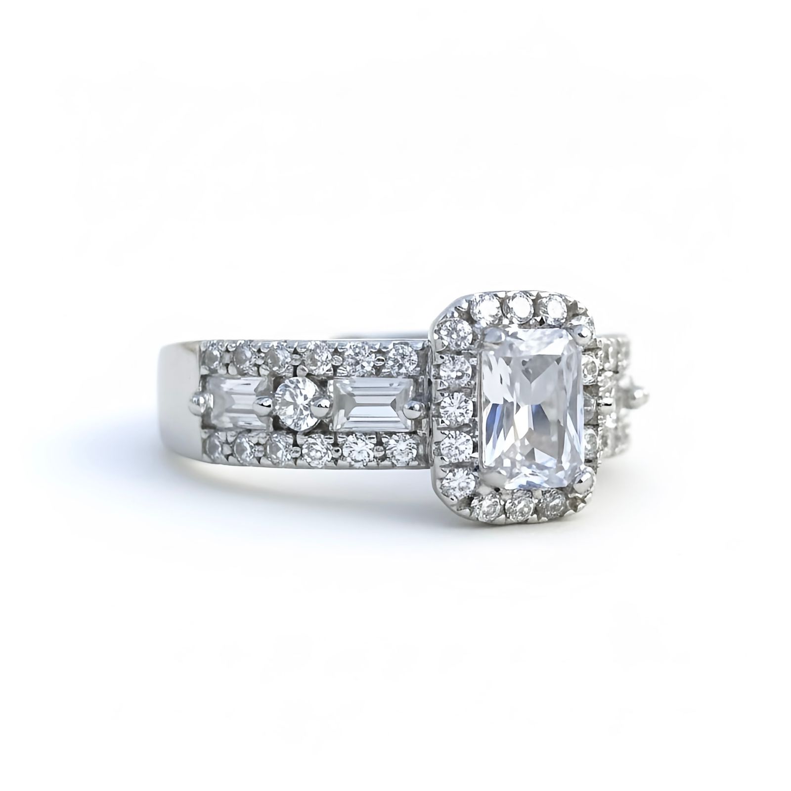 The Twilight ring is a striking, silver-toned piece featuring an emerald-cut center stone encircled by a halo. Its band is richly detailed with pave-set round and baguette-cut clear stones for maximum sparkle and a luxurious multi-stone look.